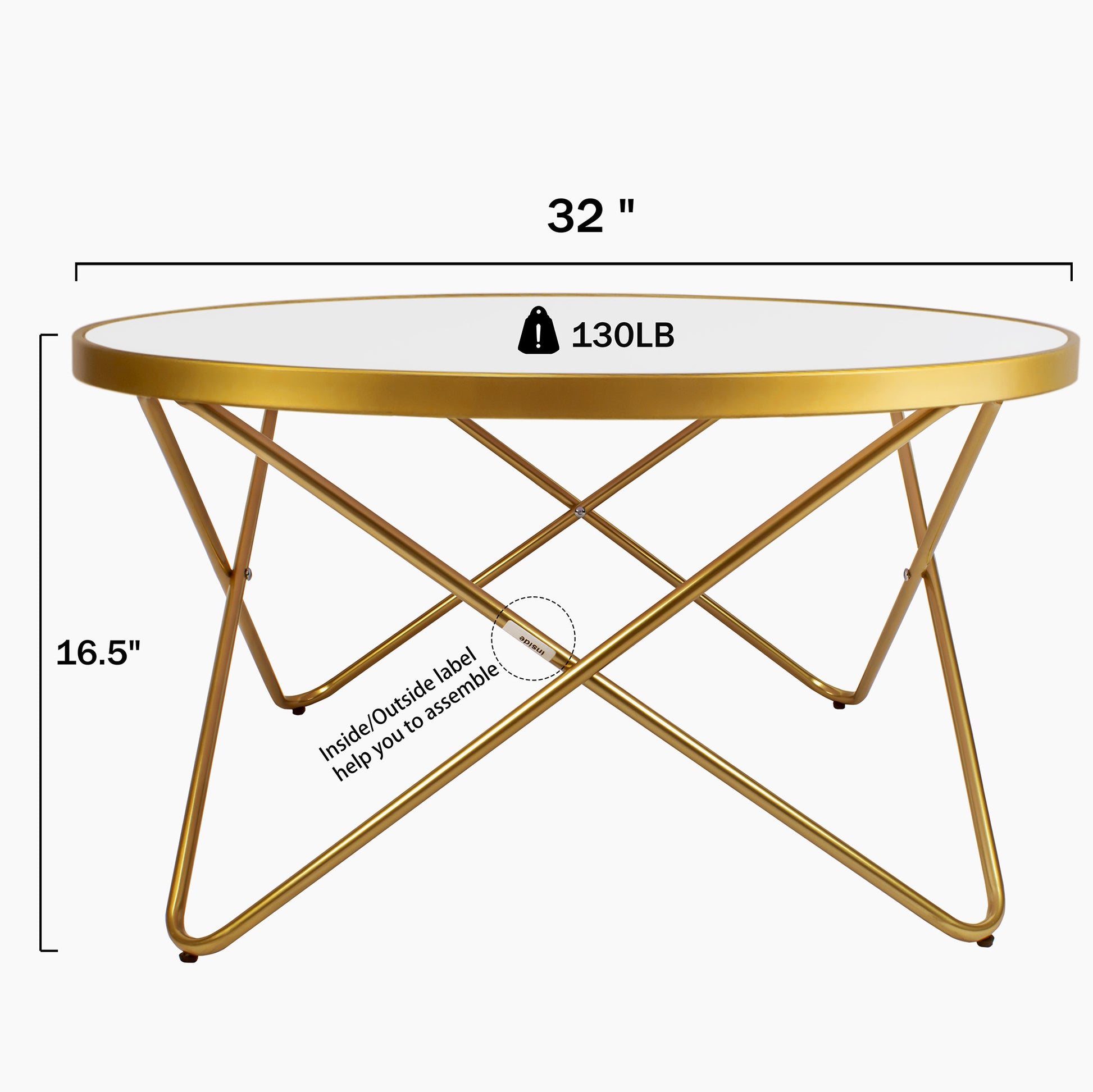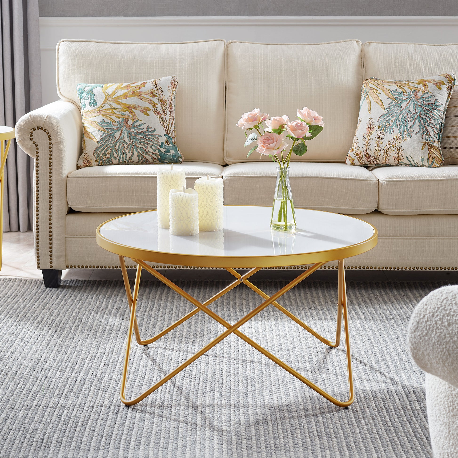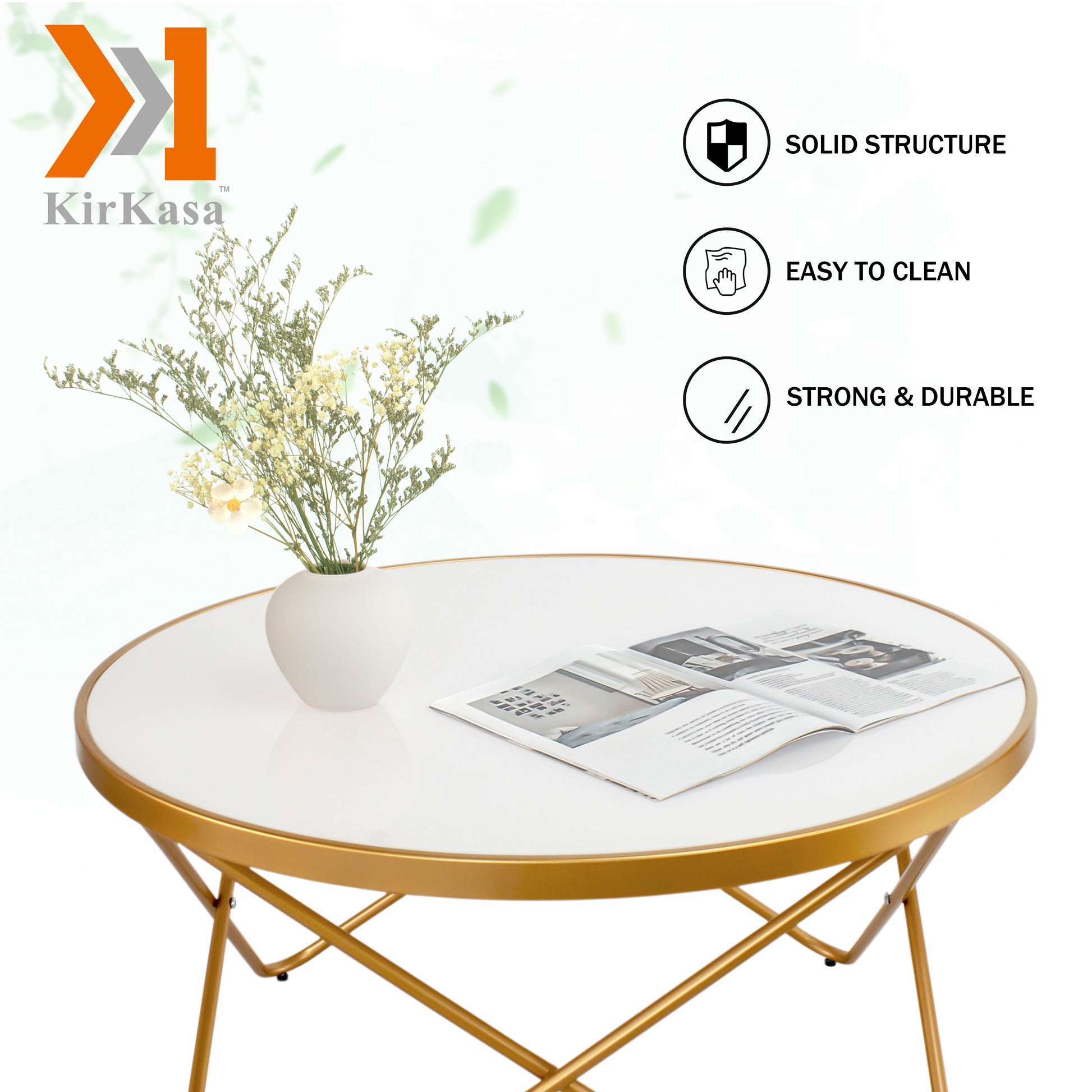 KirKasa Mid Century Modern Round Gold Coffee Table with White Glass and Metal Frame Central Table for Living Room Recepetion Room